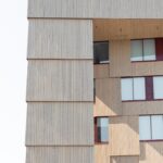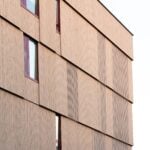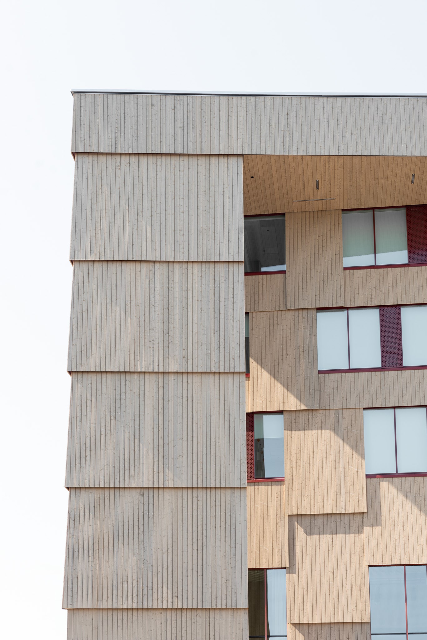 Som fasadmaterial för nybyggnaden har man använt brandskyddsbehandlad, grånad ytterpanel som monterats vertikalt. Panelerna är förskjutna både i vertikala och horisontella fogar, vilket ger byggnaden dess karakteristiska uttryck.