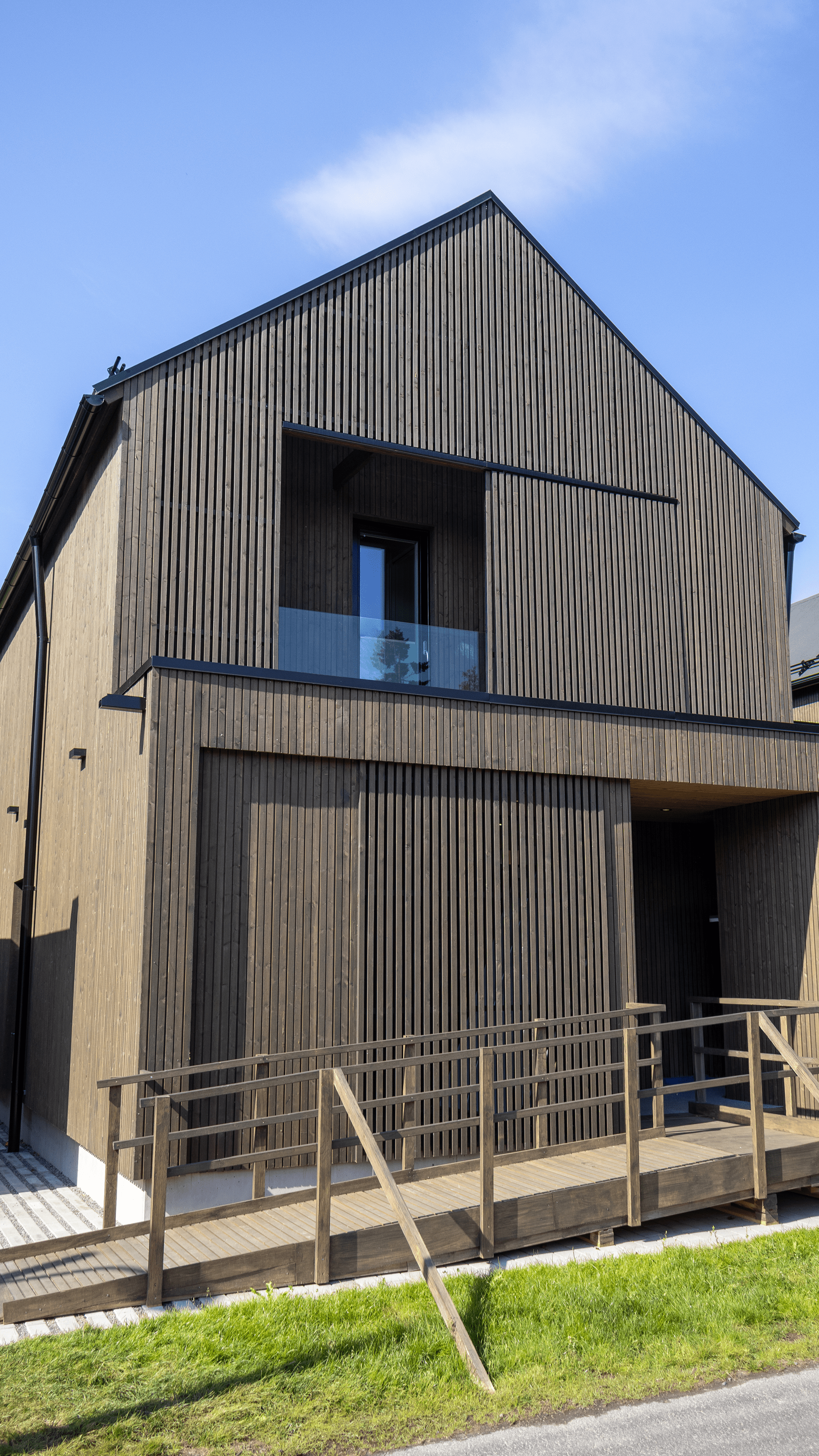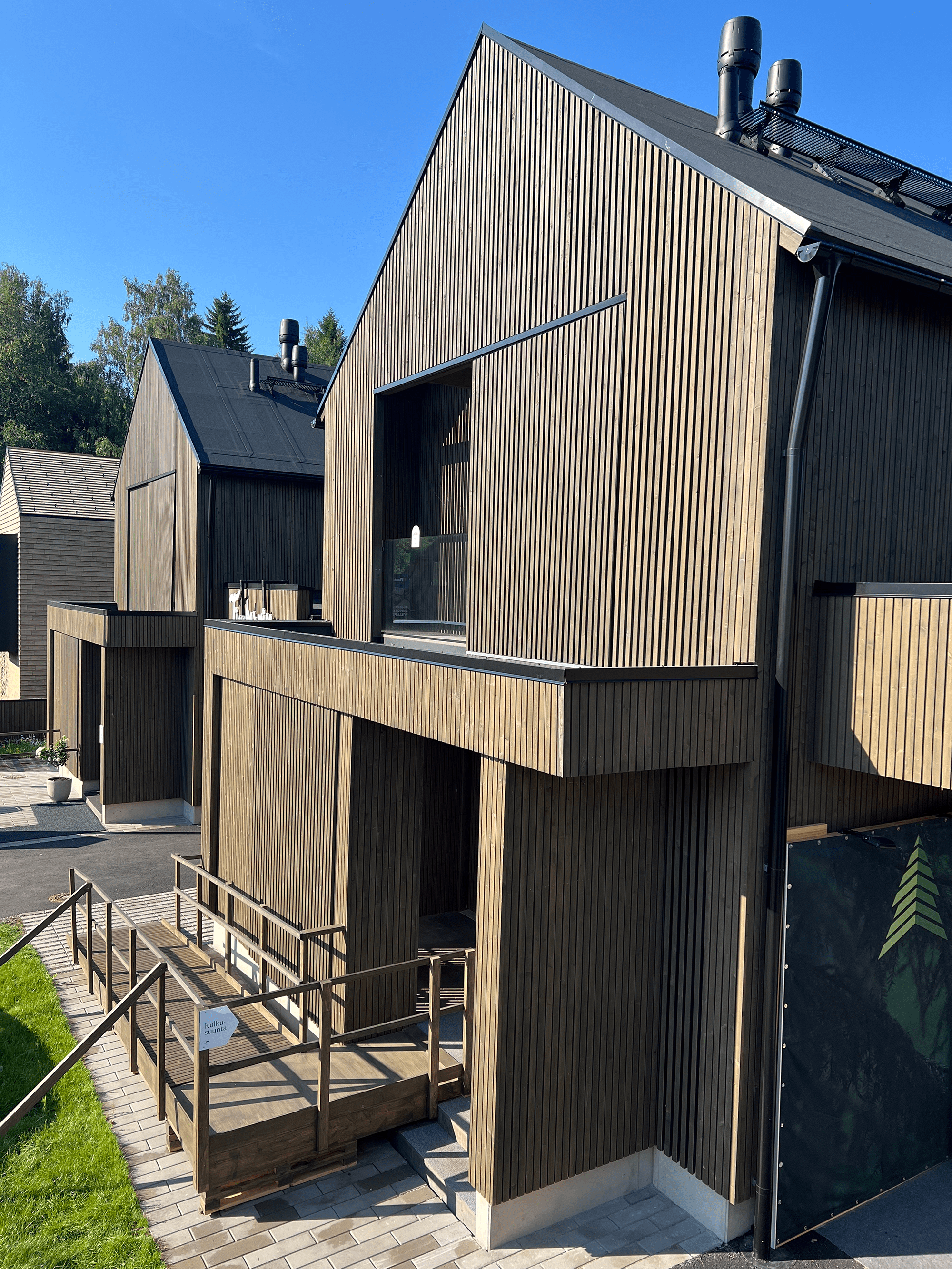 Bostadsmässprojekten Hietasaari Lyhty (Uleåborg 2025) består av tre identiska moderna villor som förnyar Hietasaaris traditionella villakultur. Vägg- och takkonstruktionerna är diffusionsöppna och isolerade med träfiber, vilket gjorde trä till ett naturligt val som fasadmaterial – ett material som är både naturligt och lätt att bearbeta. Arkitektur, ljus och gemenskap möts i denna genomtänkta helhet, där den vertikala träpanelen, målad i en lasyrton, fulländar fasaderna och framhäver träets naturliga skönhet.