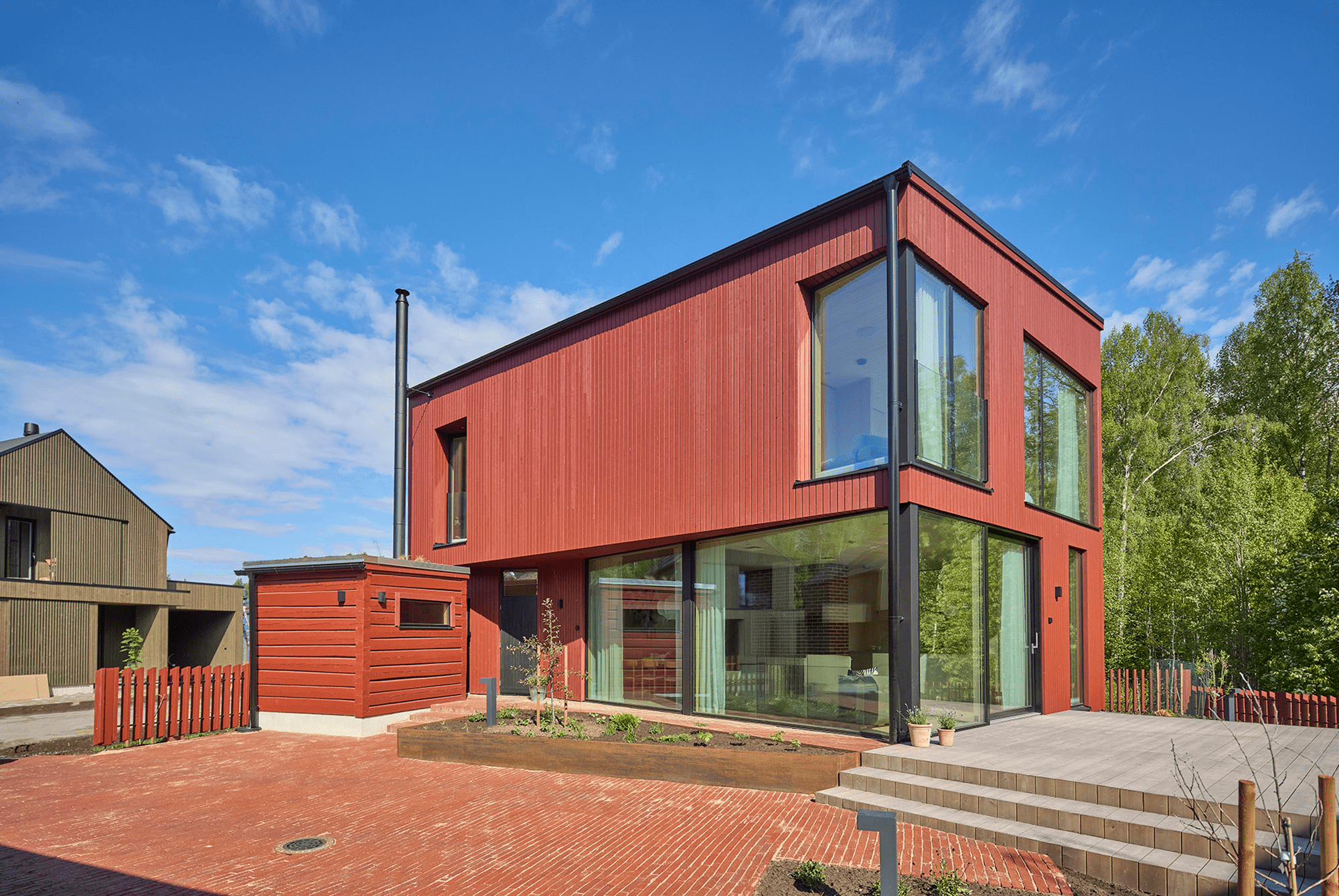 Bostadsmässprojekt Hietasaaren Veisto (Uleåborg 2025) består av två CLT-hus i olika färger. Den massiva träkonstruktionen är utformad för att vara ett tidlöst hem som håller över generationer. Fasadernas träbeklädnad skyddar byggnaderna mot de påfrestande väderförhållandena vid älvmynningen och förlänger deras livslängd.