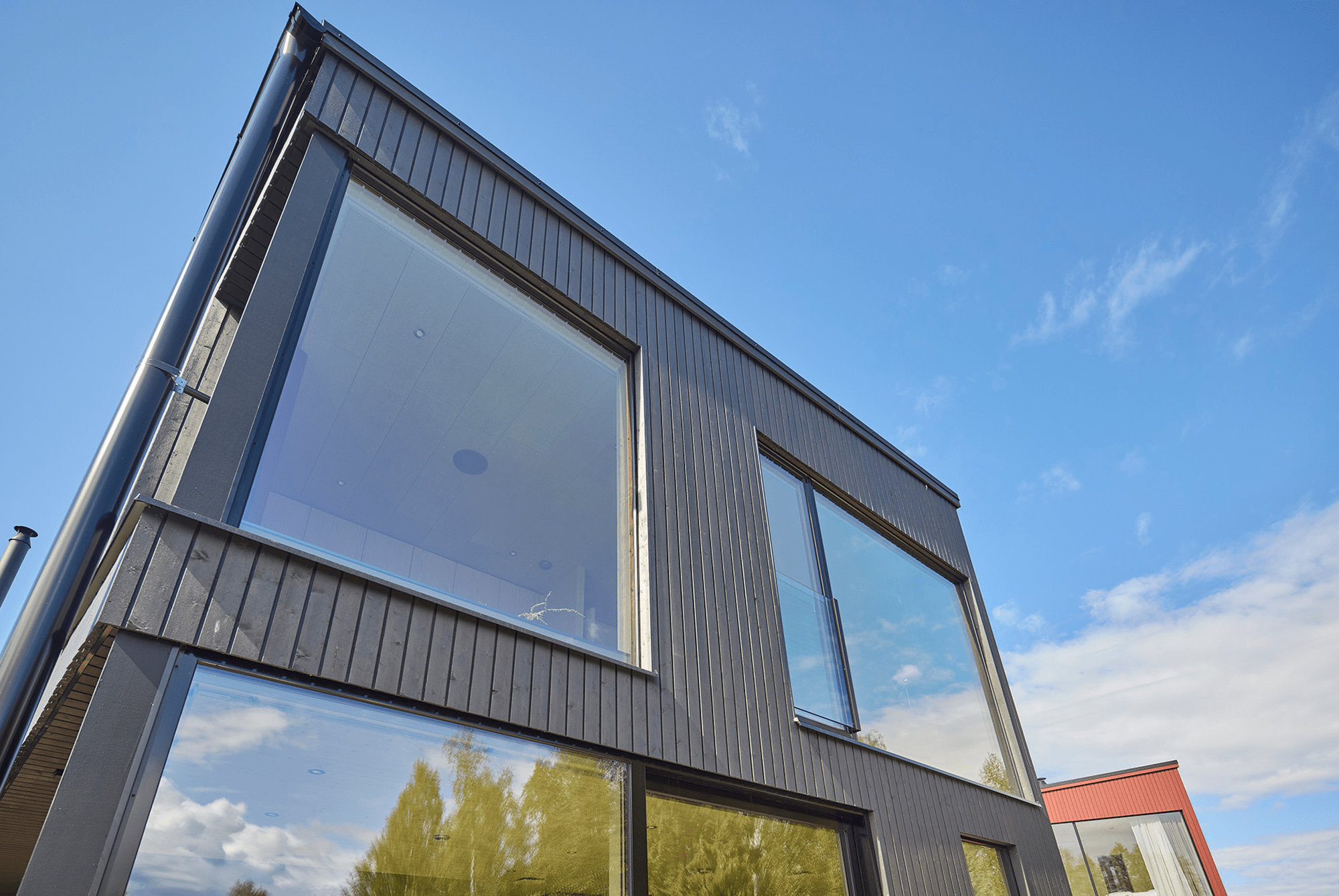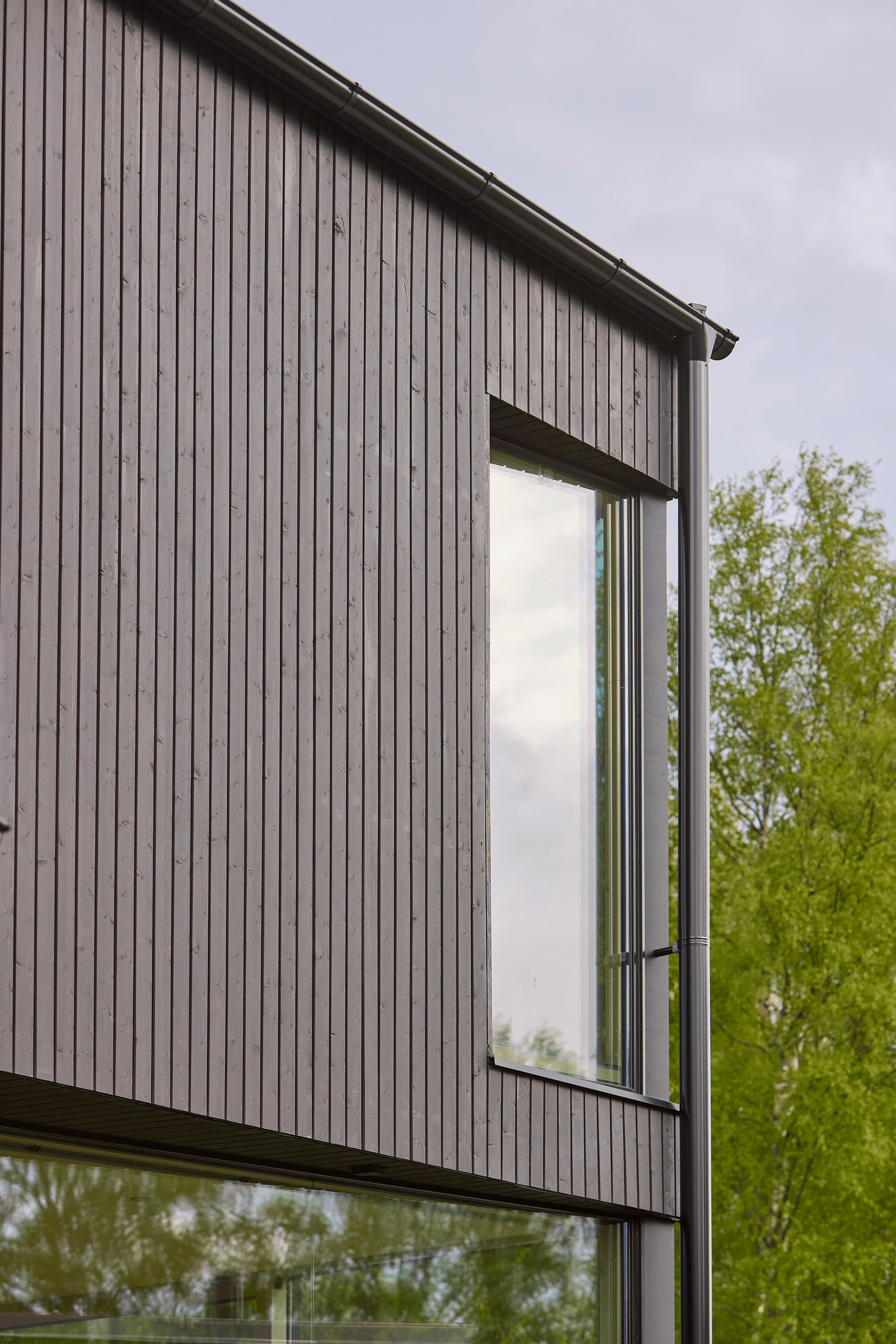 För CLT-husets ytterbeklädnad betonades enkelhet, lång hållbarhet och estetik. Det valda fasadmaterialet stöder på ett utmärkt sätt massivträkonstruktionens arkitektoniska och skulpturala uttryck och ger byggnaden ett modernt men tidlöst utseende.