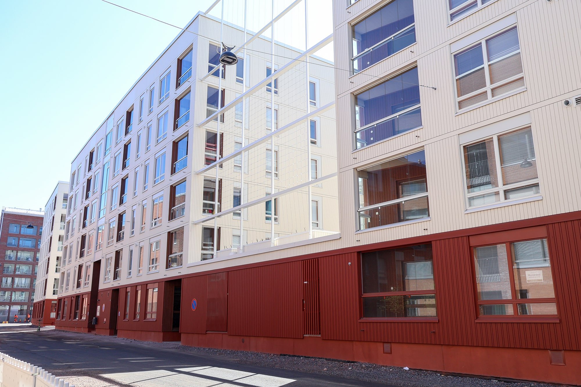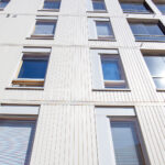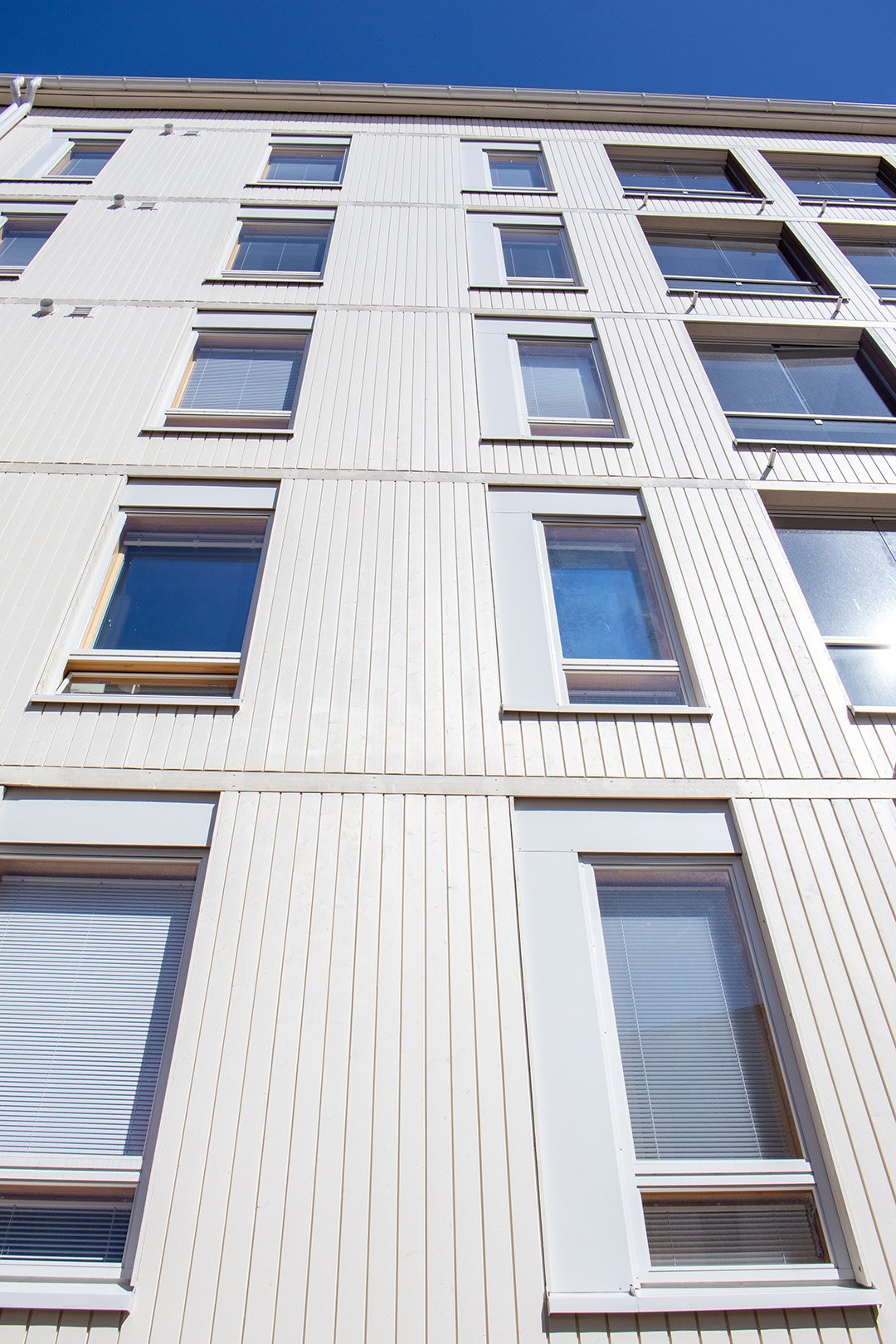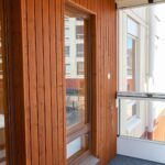 Vi levererade ytterpaneler till fasaden, som har en nyckelroll i byggnadens rytmiska och varma utseende. Vertikalt monterade träpaneler framträder i ljusa och rödbruna nyanser, vilket ger volymerna variation och en mänsklig skala. Användningen av paneler i olika bredder samt den färgsatta rytmiken skapar en dynamisk men kontrollerad helhet som livar upp stadsbilden.
