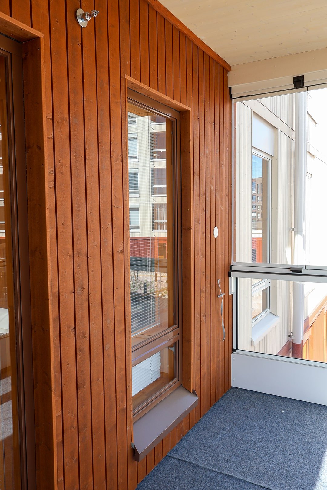Ljusa träytor dominerar största delen av fasaden, medan balkonger och bottenvåningar får kontrast och värme genom en djupare rödbrun ton. Även i detaljer som indragningar och balkongnischer ger träpanelen skydd och mjukhet åt de tydliga CLT-volymerna.