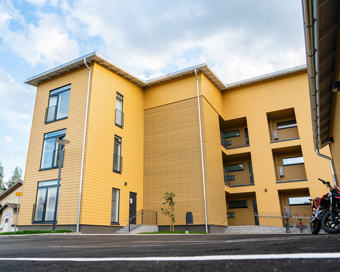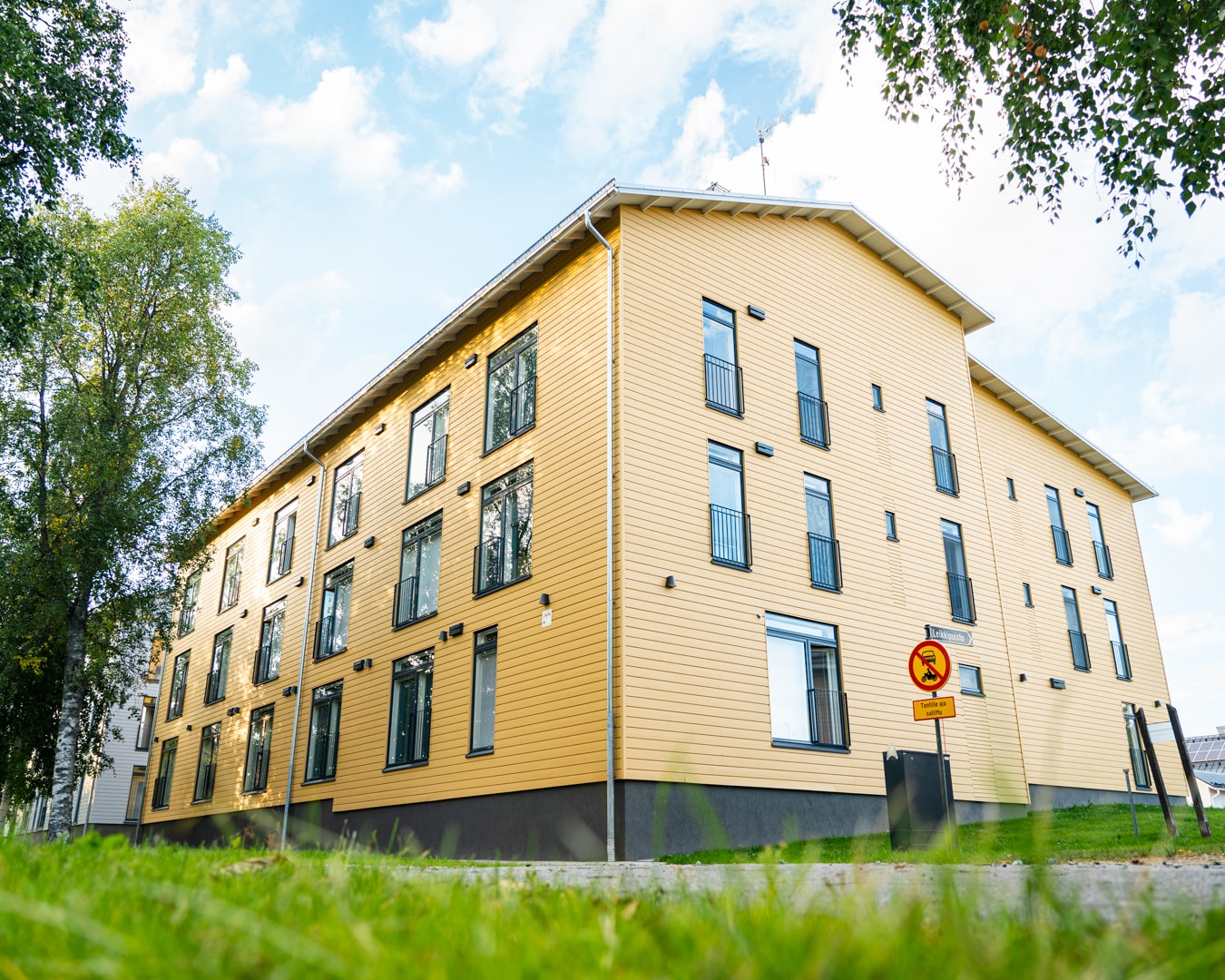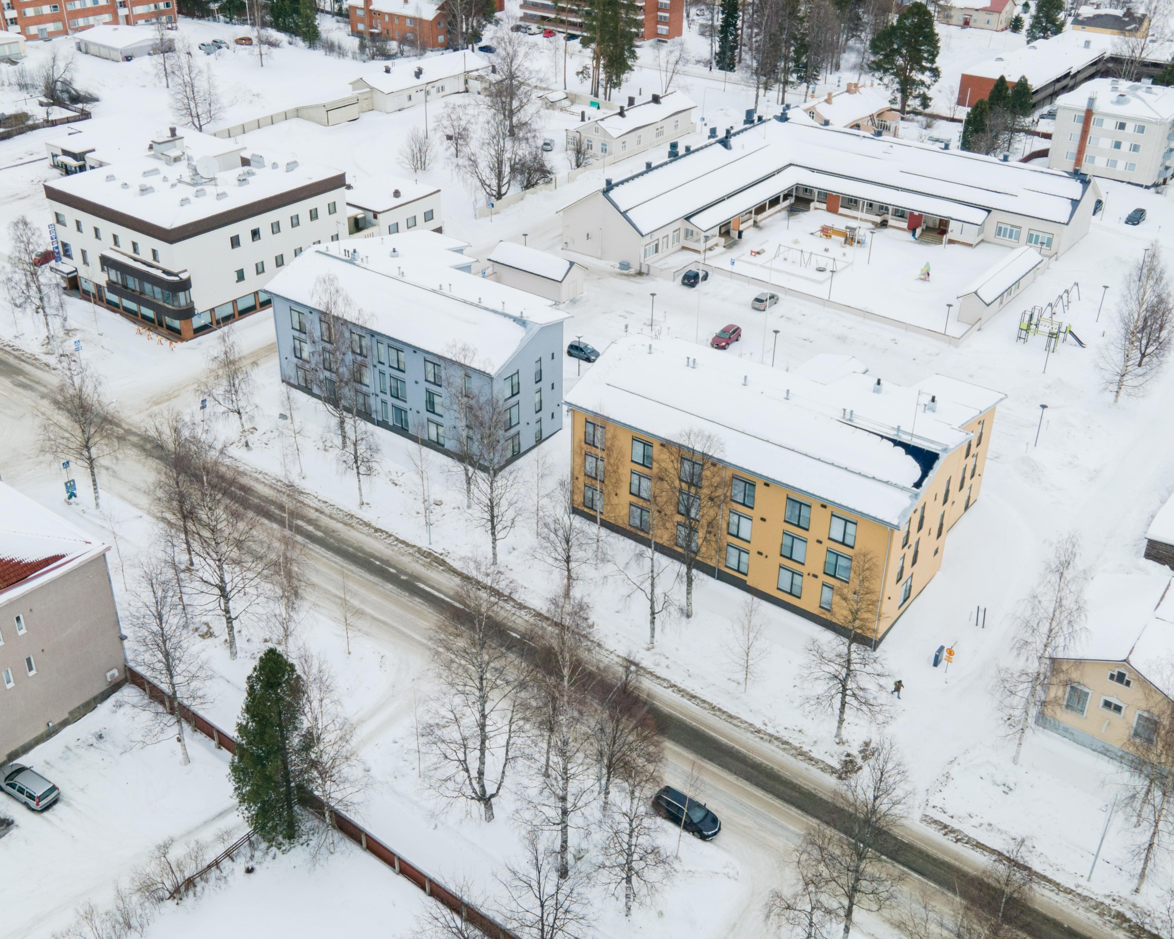 Projektet är beläget på en tidigare sjukhustomt som har förvandlats till ett livskraftigt träkvarter. På samma område har dessa två imponerande flerbostadshus och ett daghem i timmer byggts, vilket skapar en enhetlig och varm helhet i centrala Nurmes.