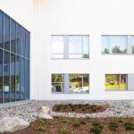 Byggnadens arkitektoniska uttryck är diskret och lugnt. Fasaderna rytmiseras av vertikalt monterade träpaneler som är täckmålade i vita och gula nyanser. De ljusa ytorna reflekterar dagsljuset och ger byggnaden lätthet, medan de gula markerade entréområdena skapar liv och underlättar orienteringen ur användarens perspektiv.