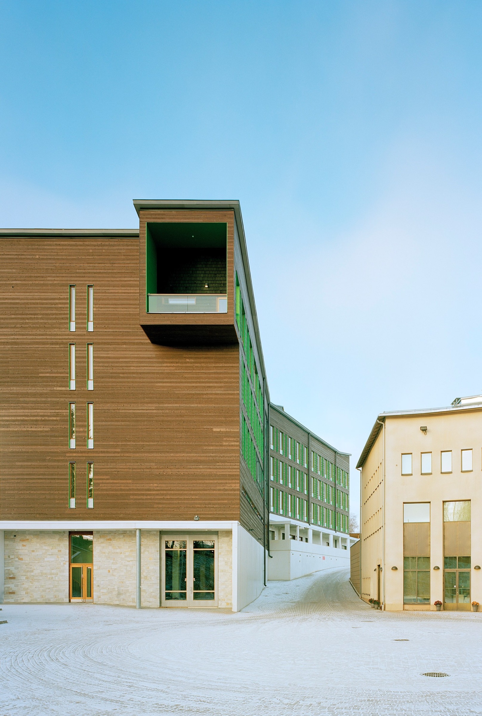 Som ytskikt för Pilkes fasad valdes mörkt behandlad gran. Träets ådring ville man inte dölja med täckande färg, utan den levande träytan har lämnats synlig. För detta ändamål passade Vaara Nordic™ ytterpanel, tillverkad av hållbart nordligt trä och industriellt målad med genomskinligt färg, perfekt.