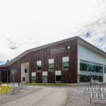 Fasaden växlar mellan mörk keramisk platta och vit träpanel, vilket ger byggnaden rytm, kontrast och tydlighet. Den keramiska plattan bildar ett skyddande yttre skal, medan de vitmålade träpanelerna med Vaara Nordic™ UTS-profilen lättar upp helheten och tillför ljus, särskilt vid entréerna.