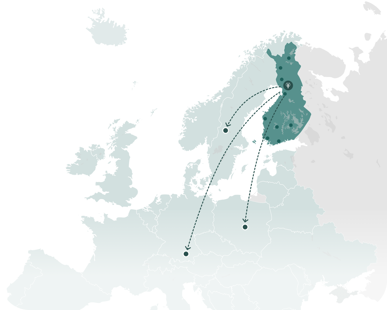 Vår träindustri ligger i Tervola, bara 5 mil från Haparanda. Det gynnsamma läget nära gränsen möjliggör smidiga leveranser till Sverige och vidare internationellt. Idag levererar vi produkter till 15 olika länder.